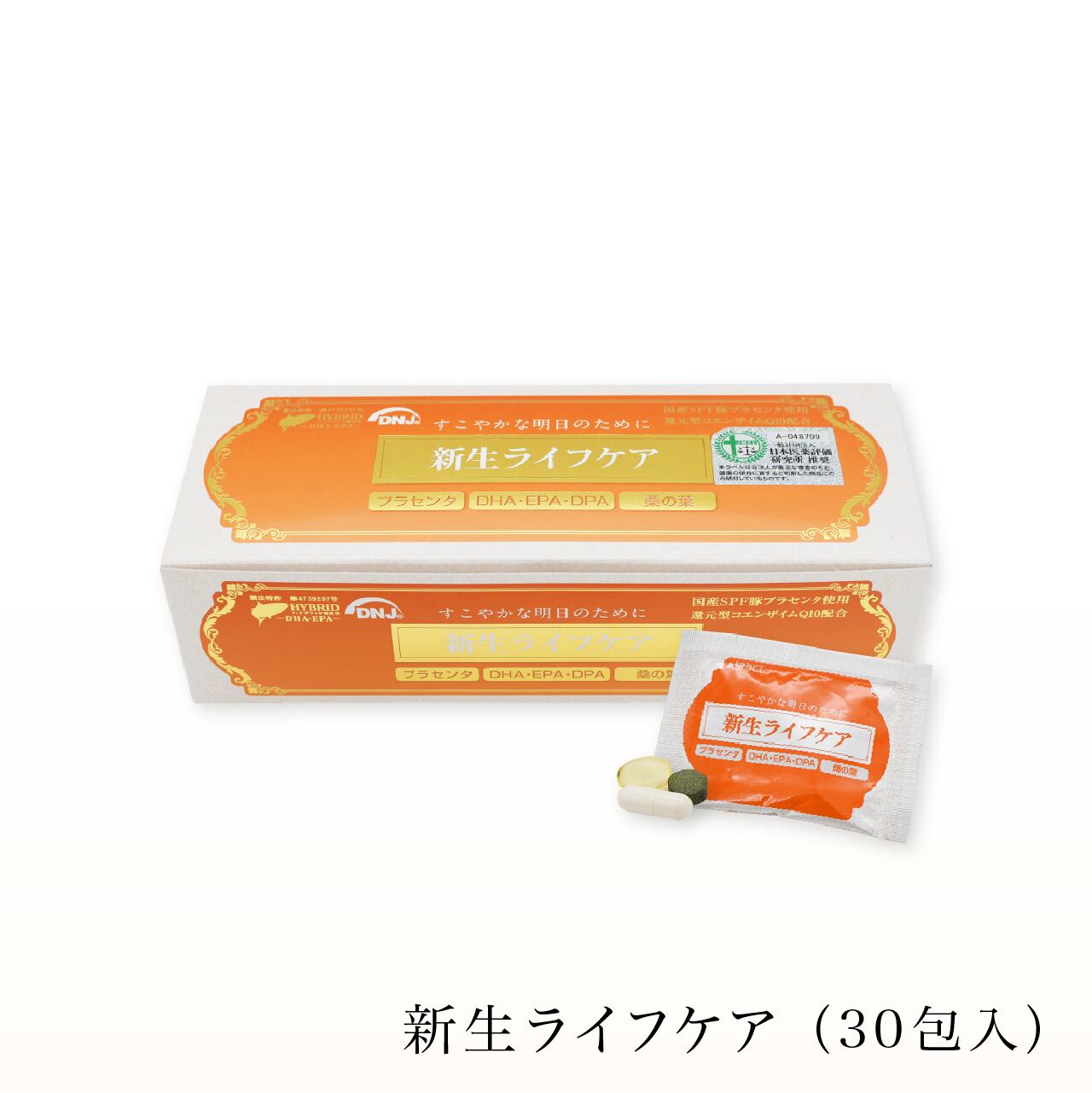 新生ライフケアは、プラセンタ、DHA・EPA、桑の葉エキスを、それぞれの特性に合わせた形状で組み合わせた、3種セットのサプリメントです。